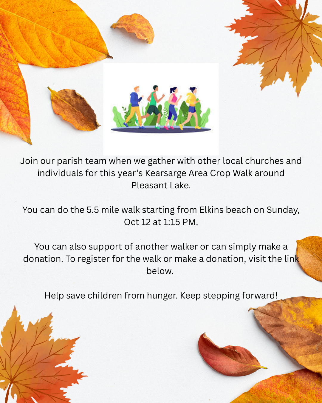 Crop Walk is coming up October 12th, 1:30 PM at Elkins Beach.