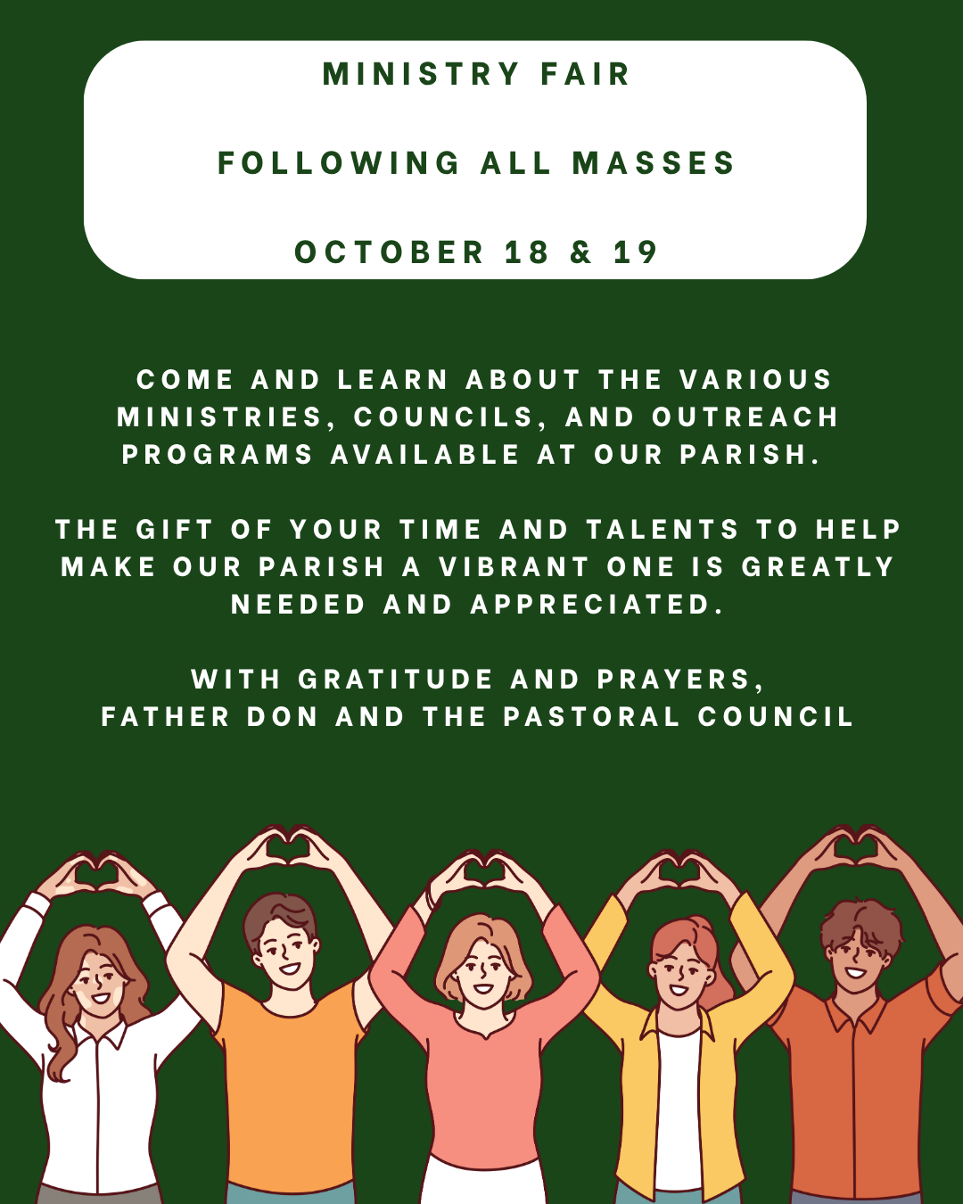 THIS WEEKEND - After all Masses this weekend, representatives of many ministries of which you may want to participate will be in the Parish Hall. God calls each of us to serve in unique ways. Whether you love to sing, teach, organize, greet or simply wish to lend a helping hand, there is a place for you in our parish ministries. Explore the ministries you how you can complete your spiritual life by serving. Stop by the Ministry Fair after Mass.
