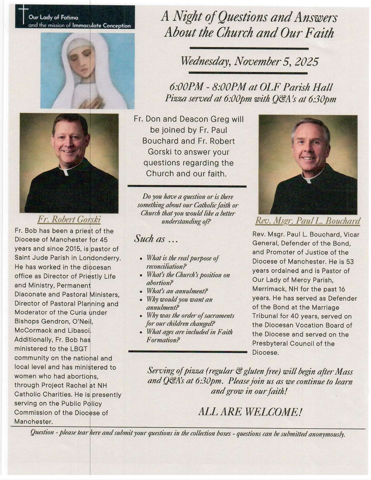 This weekend through Tuesday Bishop Libasci is meeting with Deacons and Priests in Meredith. Deacons on the weekend and then priests Monday into Tuesday. There will NOT BE DAILY MASS those days.