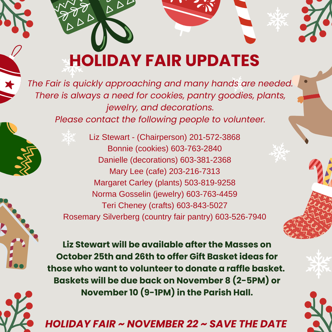Liz Stewart will once again be coordinator on the Parish Holiday Sale on November 22nd. She has a list of particular items and captains” in the bulletin. Please help out where you can!