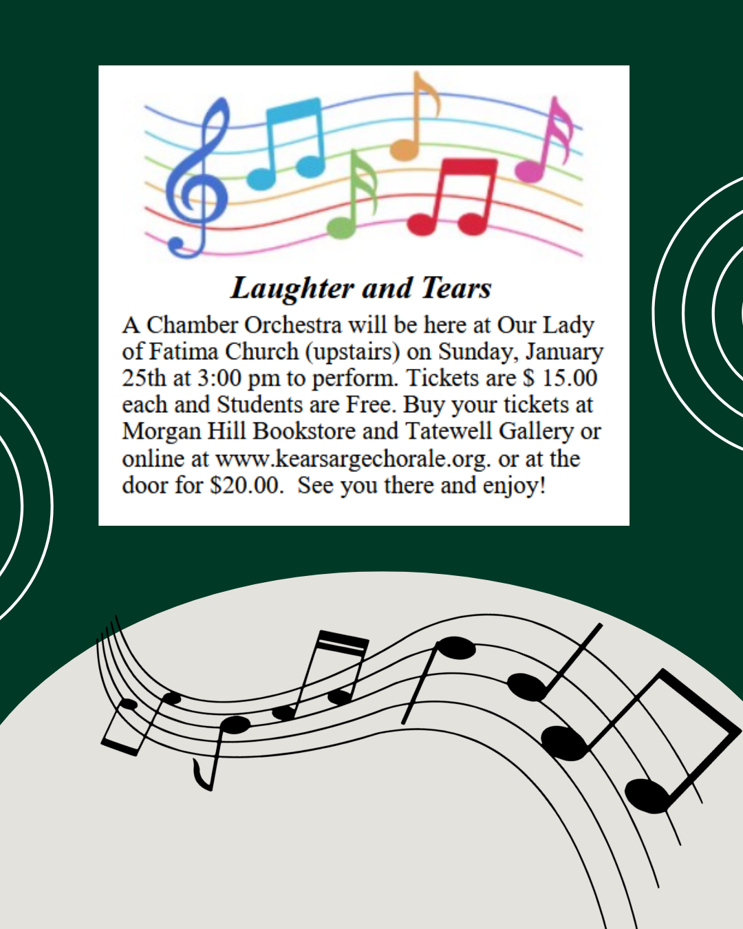 Sunday Jan 25th Laughter and Tears Concert by Kearsage Orchestra will be held at OLF at 3 PM.